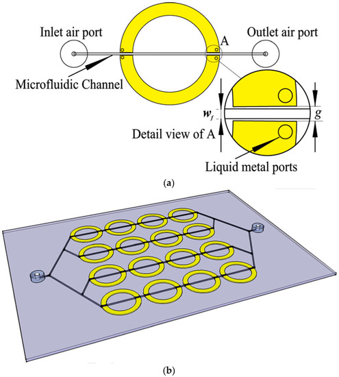 (a) Illustration of a unit cell meta-atom SRR based fully integrated microfluidic sensor with g = 0.8 mm, and wf = 0.4 mm; and (b) an integrated meta-surface SRR based sensor, consisting of 16 unit cells (redrawn from [40]).