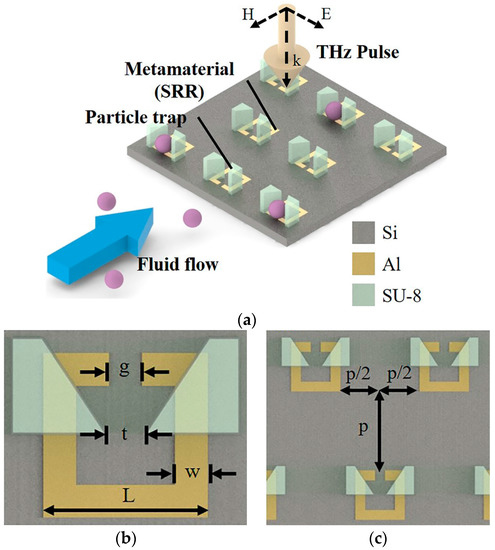 (a) SRR based sensor array (operating at THz frequency) integrated with a microfluidic system consisting of trapezoidal shaped structure to entrap the liquid particles of analyte. (b) Geometrical parameters of a unit cell (a SRR), and aligned-position of corresponding trapping structure, g = t = w = 5 µm, L = 30 µm; and (c) array design by integrating several unit cells from (b) with p = 50 µm (redrawn from [42]).