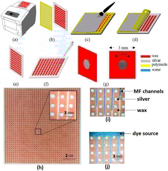 Fabrication process of metamaterial based microfluidic chemical sensor developed on paper substrate: (a) wax printer used for wax-printing on chromatography paper; (b) polyimide Sheet cut by CO2 laser used as interface layer on wax printed paper; (c) painting silver ink; (d) peeling polyimide sheet off the paper; (e) silver-painted paper after peeling off polyimide sheet; (f) flow of water through the microfluidic channels; (g) unit cell of the proposed sensor, the thickness of the chromatography paper and conductive silver disks are 90 μm and 100 μm, respectively; (h) fabricated sample (dimensions of 11.5 × 11.5 cm2), inhomogeneity of the silver disks due to low resolution in painting are shown on the inset figure; (i) flow of dye on microfluidic channel; and (j) channels are filled with dye, and the source of the dye is also shown (redrawn from [3]).