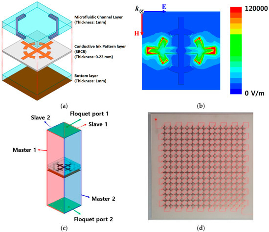 Our research group has proposed several metamaterial inspired absorbers based on ingenious ideas [43,44,45,46,47]. They were targeted to either increase absorbance, or bandwidth, or angle insensitivity, or switching capability covering two different bands. However, these absorbers were based on rigid substrates. In [48], our research group proposed a metamaterial inspired flexible absorber which works as an ethanol sensor. Flexible devices are getting increasing attention because of their use in wearable applications, such as health monitoring as well as athletic training, and extensive use in upcoming technology including the internet of things (IoT) [49]. In parallel, inkjet printing on paper substrate provides attractive features, such as low cost and quick fabrication process [50]. In addition, it is environment friendly, hazardless toward user, and additive manufacturing technology (thus, cost effective) [51]. Split ring cross resonators (SRCRs) are inkjet-printed on a photo paper substrate, serving as middle layer of unit cell (see Figure 10) [48]. A microfluidic channel is engraved on top layer (1 mm thick PDMS), and bottom PDMS layer is added to increase the absorbance. The simulation modeling is done using HFSS (High frequency structure simulator) software. A unit cell geometry has been considered, where Master-Slave boundary conditions have been applied using floquet ports, such that the unit cell can be replicated along the two-dimensional direction. Because of periodic structure (repetitiveness of unit cell), floquet ports excitations are preferred over the wave ports. The sensor is tunable using microfluidic flow through microfluidic channel which is engraved inside a PDMS sheet, and up to 5% ethanol has been detected.