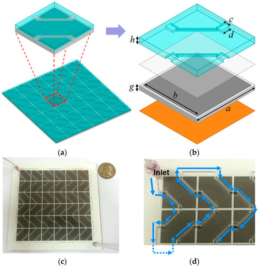 Microfluidic MM absorber as an ethanol sensor: (a) simulated model is shown; (b) unit cell consists of the microfluidic layer, bonding layer, and MM absorber layer with dimensions: c = 1.5 mm, d = 2 mm, g = 1.13 mm, and h = 1.5 mm; (c) top view of the fabricated prototype (overall structure in 6 × 6 array configuration with inlet/outlet tubes); and (d) fluid flow in the channel of the unit cell (blue color arrows) (redrawn from [9]).