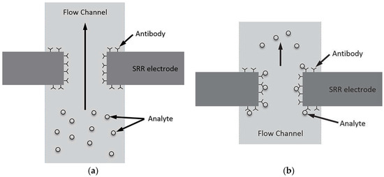 Antigen-antibody binding illustration: (a) before binding (with immobilized antibody around SRR electrode); and (b) after binding under analyte flow through a microfluidic channel (redrawn from [77]).