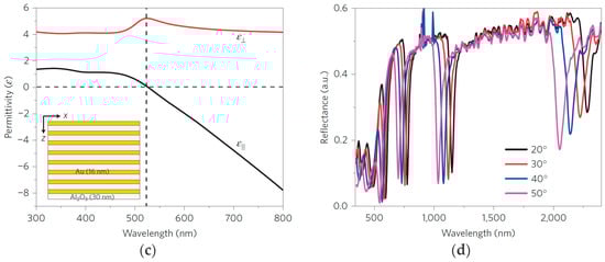 Hyperbolic metamaterial plasmonic biosensor integrated with microfluidics: (a) a 3D view of the fabricated biosensor with a fluid flow channel and a SEM image of the fabricated 2D subwavelength gold diffraction grating on top of the sensor surface; (b) photograph of the grating coupled hyperbolic metamaterial sensor device fully integrated with a microfluidic channel and sample tubing; (c) real parts of effective permittivity of biosensor, which shows a hyperbolic dispersion at λ ≥ 520 nm (dashed vertical line). In the inset the side view of fabricated biosensor is shown; and (d) reflectance spectra of the grating coupled HMM at different angles of incidence. It shows four prominent reflectance dips, corresponding to the bulk plasmon polariton modes, and two weak reflectance minima in the shorter wavelengths, corresponding to the SPP modes, all six modes are guided modes (redrawn from [85]).