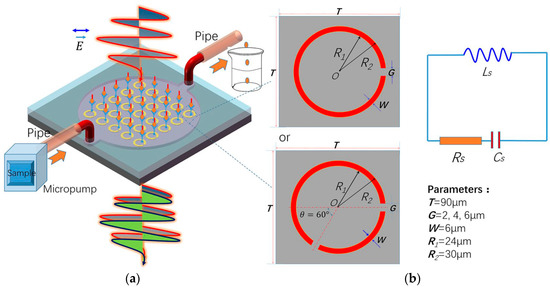 (a) THz metamaterials microfluidics biosensor; and (b) equivalent circuit with {RLC}s for the SRRs (redrawn from [86]).