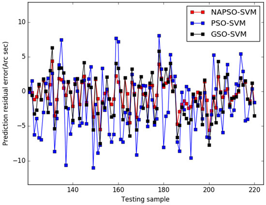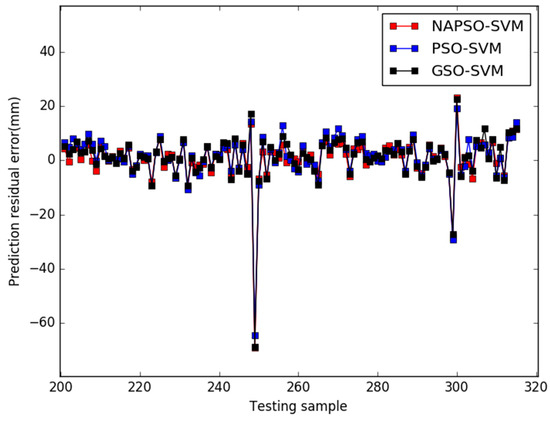 In Figure 8, it is easy to see the distribution of the four hysteresis points. The prediction residual errors are very big on the four hysteresis points. Except for the four points, the prediction residual of the NAPSO-SVM model is smallest among the three models, ranging from −9.9086 to 11.3979 mm. The prediction residual of the GSO-SVM model is ranging from −9.3916 to 11.8487 mm, and the prediction residual of the PSO-SVM model is ranging from −10.7265 to 14.0340 mm. The prediction residual range of the NAPSO-SVM model is almost equal to the GSO-SVM model, and better than the PSO-SVM model.