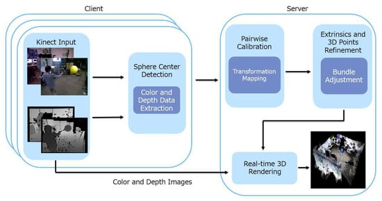The block diagram in Figure 1 shows the basic architecture and data flow of our proposed framework. Each RGB-D camera is controlled by a client process. The server process, which can be run on the same computer as the clients or a separate computer on the network, collects all necessary information from the clients to compute the extrinsic parameters. All the client processes and the server process are time-synchronized using the Network Time Protocol (NTP) with a time drift of less than 4 milliseconds []. While the accuracy of the extrinsic parameters could be measured with respect to ground truth data, the ultimate test is how well they can contribute to the 3D reconstruction of a real-world scene beyond the ground truth set. As such, our architecture is designed with this goal in mind and supports real-time 3D rendering: color and depth images are compressed and streamed to the server, which can use the previously-computed extrinsic parameters to perform 3D reconstruction in real time. Our framework applies to camera networks consisting of co-located depth-color cameras such as Kinect cameras. The main functional blocks in Figure 1 are as follows: