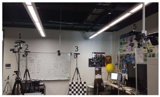 Calibrations without using any specialized reference objects or patterns have also been studied [,,]. In [], a silhouette extracted from a person was used for calibration. In [], Carrera et al. calibrated a robotic camera platform by detecting invariant SURF feature correspondences across different views. In [], the extrinsic parameters were estimated based on point correspondences established from the unstructured motion of objects in the scene. These methods typically have lower precision than those based on reference objects due to imprecise knowledge of the unknown scene features, which can lead to erroneous correspondences from different viewpoints. In [], Li et al. proposed a method to calibrate multiple cameras based on users’ joint positions. The calibration process can be accomplished by aligning skeleton data across different camera views. However, their system has difficulty in fusing noisy skeleton data from the wide-baseline camera network setup.