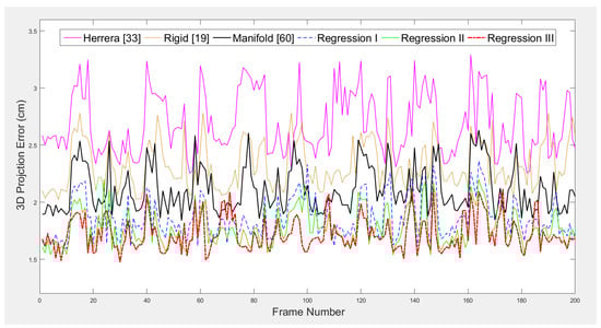 After the initial pairwise calibration, the acquired initial extrinsics are then optimized by our pseudo bundle adjustment algorithm. To test whether the estimated extrinsics can extrapolate unseen data, we apply them on a separate testing set of RGB-D images, which has the 200 detected sphere centers for each camera, to validate the correctness of the calibration. The back-projection error for each camera is compared across all the schemes. To calculate back-projection error, we use the pre-computed extrinsic matrices to project the 3D sphere center locations in local coordinates to the global frame, take the average of the projections from all the cameras, back-project it onto each local coordinate system and calculate the root mean square error (RMSE). To show that there is no bias in each method, we show the 3D projection error of Camera 1 for each frame in Figure 6. As shown in the figure, different curves representing different schemes seldom cross over each other. This shows that the relative performance among the five schemes stays constant regardless of the location of the sphere. As the plots for other cameras are similar, only the results for Camera 1 are shown in the figure. Table 2 shows the mean and standard deviation of the 3D projection errors of the entire trajectory for each camera-method combination. Table 3 shows the p-values when comparing Regression III with each the other methods, with the null hypothesis that the two methods produce similar results and the alternative hypothesis that Regression III produces better results. Based on the recommendation by Fisher [], there is very strong evidence among the majority of the cameras against the null hypothesis when comparing Regression III with Herrera [], rigid [] and manifold []. On the other hand, there is no evidence against the null hypothesis when comparing Regression III with the other two regression techniques.