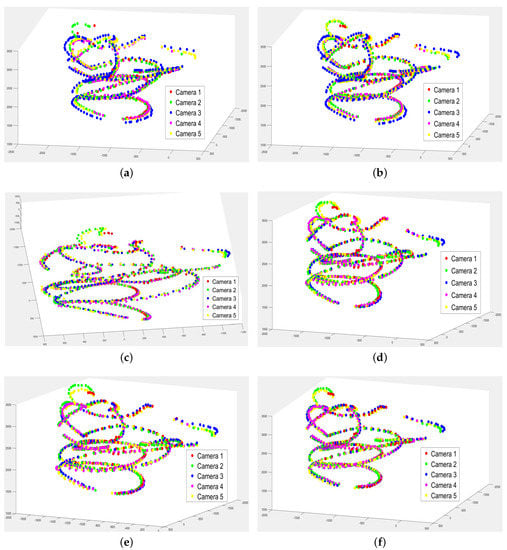 For the visual alignments, the plots of the sphere movement points in the global frames are in Figure 7. One can see that there are significant misalignment error among trajectories from different cameras in Herrera’s scheme and the rigid scheme. The manifold scheme produces a skewed global frame, but appears to produce reasonable alignment. All regression schemes produce similar alignment results, with minor improvements as the degree of freedom increases. Table 4a–f shows the average differences in sphere center location between each camera pair with respect to Figure 7a–f. We should caution that while the testing data are different from the training data, they are all captured in the same center area where there is a significant overlap among the fields of view of different cameras. To extrapolate the coverage into areas with little overlap, we evaluate in the next section the visual quality of captured 3D environment including static background and moving foreground when the system performs real-time 3D rendering.