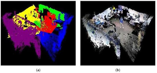 With the advent of low-cost commodity RGB-D cameras, there are now software libraries that can easily align the depth image to the color image for an RGB-D camera []. However, a common assumption of all these methods is a close baseline among different cameras so that the transformation among different views can be easily accomplished. Based on [], the works in [,,] calibrated an RGB-D camera network to reconstruct 3D objects. Nevertheless, none of them can accurately reconstruct an entire 3D scene including static background and dynamic foreground as they utilized the checkerboard and iterative closest point algorithm to align dense point clouds of foreground objects. The reconstructed background scenes would be misaligned based on their proposed methods.