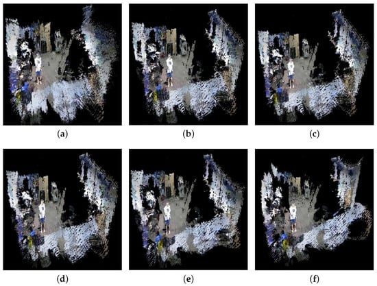 Comparison of 3D point cloud alignments on the indoor environment. From the top to the bottom (row-major order): (a) Herrera []; (b) rigid []; (c) manifold []; (d) Regression I; (e) Regression II; (f) Regression III.