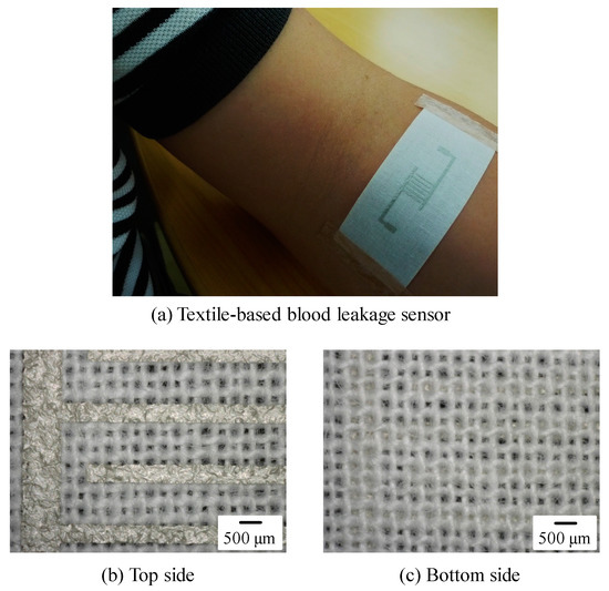 To prevent such accidents during hemodialysis, various sensors to detect blood leakage have been proposed [2,3,4,5,6,7]. Of these, a flexible sensor based on a film substrate fabricated using printing technology seems appropriate [6,7]. Patients must be dialyzed two or three times per week; therefore, mass-production techniques must be applied to provide many disposable sensors inexpensively. However, a film substrate is unsuitable for attaching to the arm, as patients will feel some discomfort because plastic film is hard and essentially impermeable to air. Hence, it would be preferable to develop a sensing structure on a soft, breathable material, such as a textile. Another problem in sensing blood leakage is low accuracy. For example, a sensor that detects conductivity between two electrodes detects blood via an increase in conductivity because the electrodes are covered by blood. However, this type of sensor detects other liquid materials such as sweat, which is also conductive. Patients may sweat due to fear or pain caused by inserting needles, or because of the temperature of the treatment room.