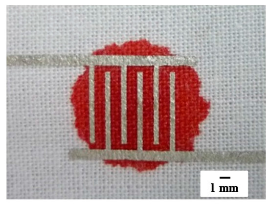 To form electrodes on textiles, we employed a screen-offset printing machine (SO-1010) manufactured by the Mino Group, Gujo, Japan. Ag ink (MP-501SO/6322O), which can be used as room-temperature curable conductive ink, was also acquired from the Mino Group. The ink was overprinted two or three times on the silicone blanket to prevent wiring disconnection because of an overly thin conductive pattern. A screen mask with an interdigitated pattern was purchased from Mesh Corp., Osaka, Japan. Silicone blankets were composed of a polydimethylsiloxane sheet and a base film. Substrates used were commercially available cotton textiles. Using these materials, we printed interdigitated electrode patterns for a blood leakage sensor with line and space (L/S) widths of 500 μm/1000 μm on the textile.