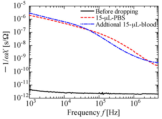 Sensor values of −1/ωX as a function of frequency f obtained before and after dropping 15 μL of PBS, and after dropping an additional 15 μL of blood.