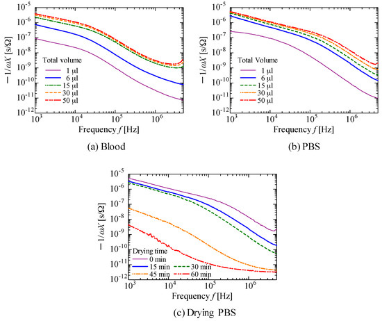 Sensor values of −1/ωX as a function of frequency f obtained when up to 50 μL of (a) blood or (b) PBS was dropped on the sensor. The sensor, on which a total volume of 50 μL of PBS was dropped, was dried at room temperature; spectral dependence on drying time is shown in (c).