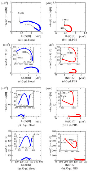 Figure 6e,g indicate that blood exhibits dielectric relaxation at frequencies higher than ~25 kHz, whereas it cannot be observed in the case of PBS. When dielectric relaxation occurs, capacitance C (≈−1/ωX) drastically changes [35]; the decrease in −1/ωX observed at a frequency of 30 kHz−1 MHz shown in Figure 5a is due to dielectric relaxation of the blood. In contrast, PBS does not demonstrate dielectric relaxation (Figure 6b,d,f,h) in the measured frequency range, indicating that a change in −1/ωX does not occur. However, a sensor on which small volumes of PBS (e.g., 1 μL) were dropped, shown in Figure 5b, and a sensor that was dried for 30 min, shown in Figure 5c, resulted in a significant decrease at the same frequencies; although this significant decrease in −1/ωX is not known, it may result in detection errors if we try to detect blood only by observing the value of the slope.