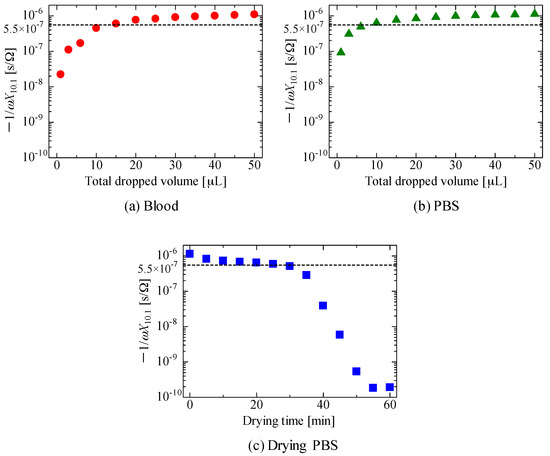 This problem can be avoided with the following two steps. (i) At a certain frequency, an appropriate threshold of −1/ωX is determined; a low value is excluded at this phase. As described above, a small volume of PBS induces a large decrease in −1/ωX at 30 kHz−1 MHz, as shown in Figure 5b,c. Therefore, by setting a proper threshold, we extracted a larger amount of blood or PBS. (ii) Then, for the extracted conditions, we checked the decrease in −1/ωX caused by the dielectric relaxation of the blood. As an example of the first step, Figure 7a,b show the values of −1/ωX10.1 replotted as a function of the dropped volume corresponding to Figure 5a,b, respectively, where X10.1 is the reactance at 10.1 kHz. Similarly, Figure 7c depicts −1/ωX10.1 as a function of the drying time corresponding to Figure 5c. For example, the threshold of (i) is assumed to be −1/ωX10.1 = 5.5 × 10−7 [s/Ω]; cases in which the total dropped volume is less than or equal to 10 μL in Figure 7a and less than or equal to 6 μL in Figure 7b, and in which the drying time is greater than or equal to 30 min in Figure 7c are excluded at this phase.