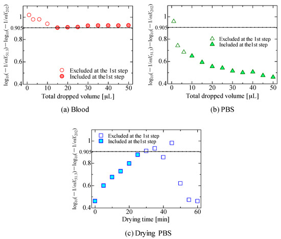 Slope values of log10(−1/ωX51.3) − log10(−1/ωX202), as a function of the volume obtained when (a) blood or (b) PBS was dropped to the sensor. The slope value as a function of the sensor’s drying time in which a total volume of 50 μL of PBS was dropped is shown in (c). Excluded and included conditions at the first selection step, estimated from Figure 7, are indicated in each figure. Furthermore, the minimum slope value shown in (a) is 0.905, which is indicated in other figures as a visual guide.