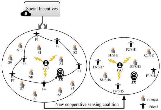 As shown in Figure 1, the PU, SR and a crowd of mobile users, including the friends (i.e., from F1 to F6) within the social circle of the SR and the strangers (i.e., from S1 to S10), randomly distribute in a certain region. Specifically, when a SR needs multiple mobile users helping co-operatively detect the status of PU, it will send out the request both in and out its own social circle. In the social circle of the SR, since they have strong relationship and frequent interactions with the SR, the idle friends among them (i.e., the users F2, F3, F4 and F6) will help the consolidation of friendship and the equivalent returns in future, especially those who have received the assistance of the SR previously. While for the ones out of the social circle, i.e., the strangers form S1 to S10, they will apply for participating in the sensing community considering the acquirement of social rewards including community recognition, community membership and new friends, especially for the ones who has not yet joined in any community or social network. However, some malicious users may also intend to join in the sensing community and consequently attack the sensing data or sensing users. Thus, it is necessary to design a reputation-based selection mechanism, aimed at making a preliminary selection of the strange sensing applicants. Namely, the users who willing to join in the sensing coalition need to firstly send a validation message including its current reputation value to the SR who then perform the selection of candidate sensing users. In the end, the joining helpful friends (i.e., the users F2, F3, F4, F6) and selected strange applicants (i.e., the users S1, S2, S3, S8) compose a new sensing coalition where the number of SHs is (specifically, in Figure 1, ) and they will conduct a co-operative spectrum sensing to help the SR determine the status of the PU. Table 1 shows the descriptions of crucial notations in the proposed model.