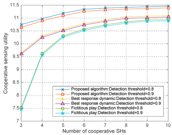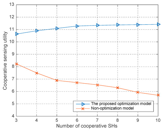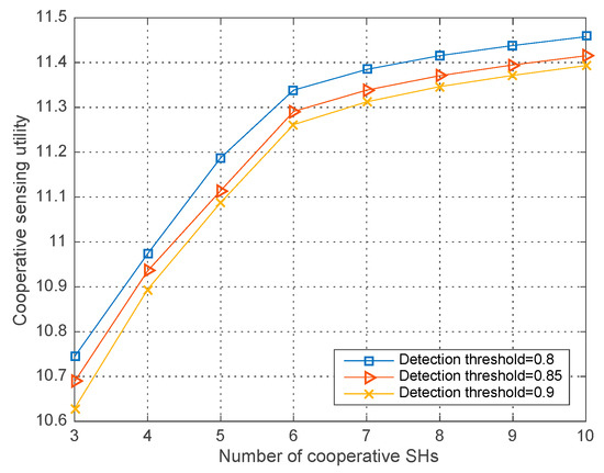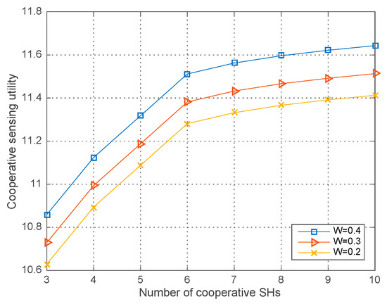 Co-operative sensing utility vs. the number of co-operative SHs with different .