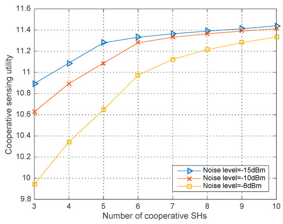 Figure 4 shows the co-operative sensing utility with different noise level , , dBm and , . As we can see that given the number of co-operative SHs, the higher level of the noise, the lower co-operative sensing utility. The reason is that the high noise level can incur to the degrading received SNR and decreasing detection probability for each SH. In the end, the lower co-operative detection probability results in the lower co-operative sensing utility when the global sensing cost remains fixed.
