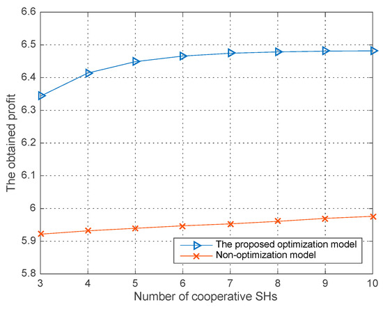 The obtained profit vs. the number of co-operative SHs in different models.