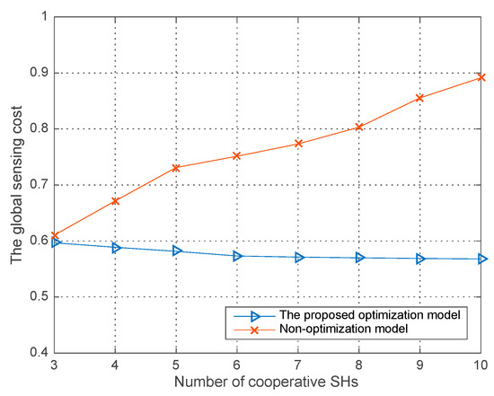 Figure 6 shows the global sensing cost versus the number of co-operative SHs in the two models. We observe that without the optimization process for the sensing time of each SH, the global sensing time cost will rapidly increase with the number of co-operative SHs. While for our proposed model, compared with the fixed sensing time of each SH in non-optimization model, the dynamic optimization process can even decrease the global sensing cost with the increasing number of co-operative SHs.