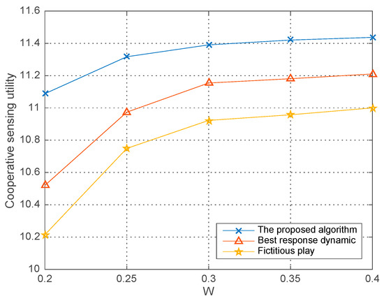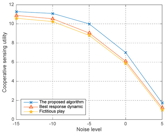 Figure 10 illustrates the co-operative sensing utility versus the noise level ranging from dBm to dBm in different algorithms given the PU’s power and detection threshold . We observe that the co-operative sensing utility decreases over the increasing noise level in all the three algorithms. Meanwhile the curves in the figure also demonstrates that a better performance, i.e., a better optimal solution can be obtained in our proposed algorithm compared with the two typical algorithms seeking for the equilibrium in game theory based optimization problem.