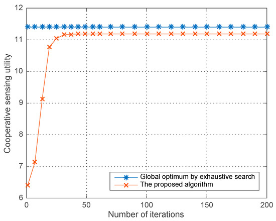 Co-operative sensing utility obtained by proposed algorithm and exhaustive search.