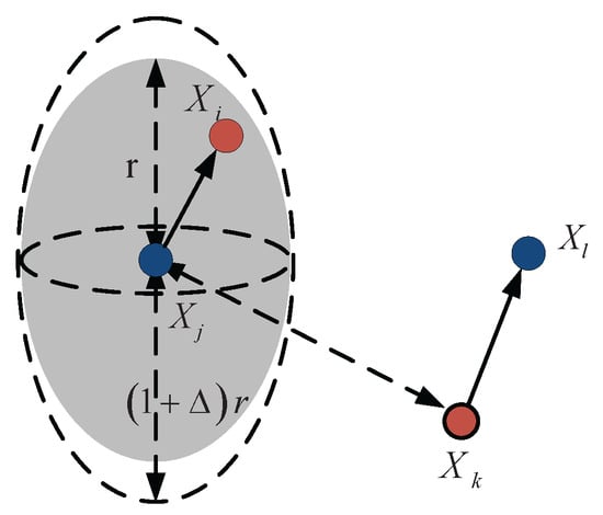 Based on Equation (4), we now consider the packet delivery rate of one-hop transmission in a 3D UACN. Suppose that the node is receiving a packet from the node over a underwater acoustic channel. The transmission is successful if there is enough spatial separation from simultaneous transmissions of other nodes, otherwise fails. Let us focus on a time slot. We assume that there are N nodes which are randomly deployed in a cuboid area. We fix a sender density parameter , and randomly designate senders and receivers, which constitute M communication pairs. We randomly select a pair of communication nodes, as shown in Figure 1. When the source node transmit packet to the receiver , the simultaneous transmission of the interference node will limit the throughput. The protocol model denotes a range of transmission r to avoid the collisions which cause the loss of the packets. Successful transmission is obtained if the source node is in the ellipsoid-neighborhood of the receiver and other interference nodes are out of the ellipsoid-neighborhood of the receiver. For any selected communication node pair, the weighted distance based on (4) is given by