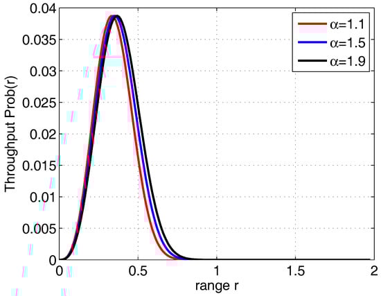 Then, we change the value of the propagation factor in the network. As Figure 3 shows, when changes, the corresponding optimal value of range r changes accordingly. The optimal throughput of the one-hop transmission does not change much under the same network parameters.