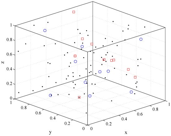 Figure 4 shows the simulation scenario. The nodes in the network are uniformly distributed. The red-square nodes are the source nodes, the blue-circle nodes are the receivers, and the remaining black nodes are inactive nodes. In this simulation experiment, we fixed the total number of nodes in the network, to explore the impact of different sender density on the throughput of one-hop transmission. For X, Y, Z axis boundary, we set . Other parameters are set to , and . To keep network connectivity, we have chosen the optimal transmission range with different sender density parameters.