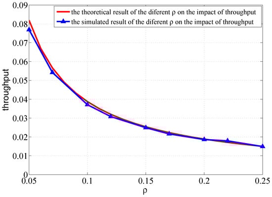 Both the simulated results and the theoretical results are plotted in Figure 5. It can be observed that the throughput of one-hop transmission decreases when the sender density increases. This is because the bottleneck of the node transmission is mainly caused by the collision of the simultaneous transmission. The higher is sender density, the stronger is the interference of simultaneous transmission. The interference between the nodes transmission becomes the main factor that affects the delivery rate of one-hop transmission.