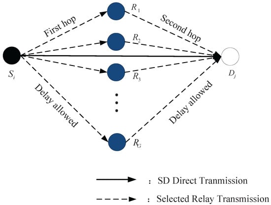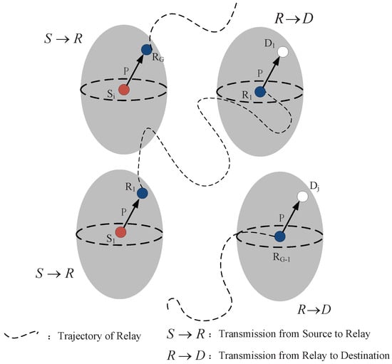 There are N fixed nodes uniformly distributed in the network. At the beginning, there are nodes requested to transmit packets, and, accordingly, the nodes randomly select other M nodes as their receivers. We assumed that every source node transmits one packet in a time slot, so there are M packets and communication pairs. We denote them SD pairs. The SD pairs can utilize G relays to transmit packets. Once a relay successfully receives the data packet from one source node, it can transfer packet to the destination node via a one-hop transmission until the relay move to position within the transmission range of destination, as shown in Figure 6.