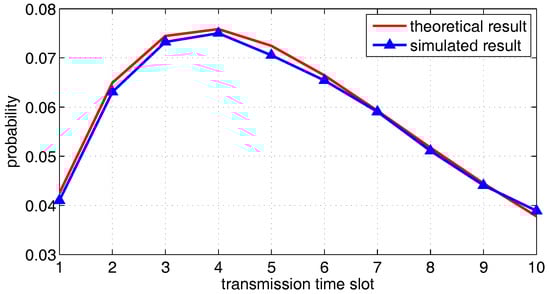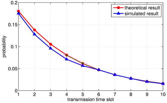 We first compare the theoretical results of one transmission pair derived in the previous section against the outcome of simulations. For X, Y, Z axis boundary, we set . Other parameters are set to , , , and the number of mobile relay points . Figure 10 shows the probability (i.e., in Equation (14)) that the source packets are transmitted to the relay nodes in different transmission slots. Figure 11 shows the probability that a packet of the relay is successfully handed off to the destination (i.e., in Equation (17)). It can observed that the theoretical result is generally consistent with the simulated result, which verifies the correctness of the derived theoretical result.