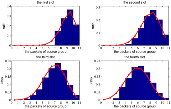Next, we consider multiple transmission pairs based on two-hop transmission. The X, Y, Z axis boundary is set to , and other parameters are set to , , , and . Figure 12 and Figure 13 show the theoretical probabilities distribution of packets left at source group and the simulated histogram under 1000 independent trials, from the first time-slot to the eighth time slot. Figure 14 shows the mathematical expectation of packet numbers in different transmission slots. There is very good agreement between the analytical model and simulated results, which verifies the correctness of the previous derivation.