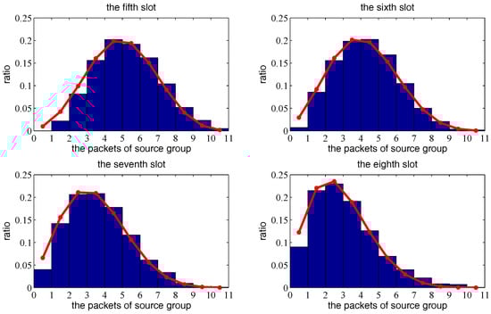 The distribution sequence of the source group based on two-hop mobile relay transmission strategy from the fifth slot to the eighth slot, as a function of the transmission delay. The red curve is the theoretical result. The blue histogram is the simulated result.