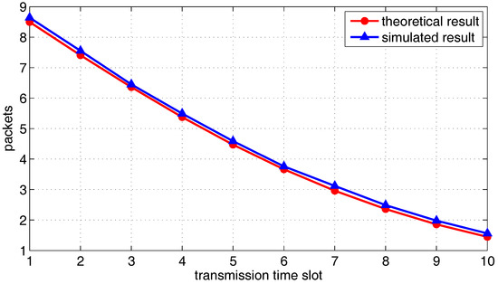 It can be observed in Figure 11 that reaches a peak value after some delay. The proposed scheme is more suitable for delay tolerant service. Nevertheless, a large delay is not required. Figure 11 shows that, after 10 time slots, more than 70% of the source packets will be delivered to the destination nodes.