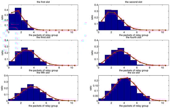 The distribution sequence of the packets left at the relay group, from the first slot to the sixth slot. The red curve is the theoretical result. The blue histogram is the simulated result.