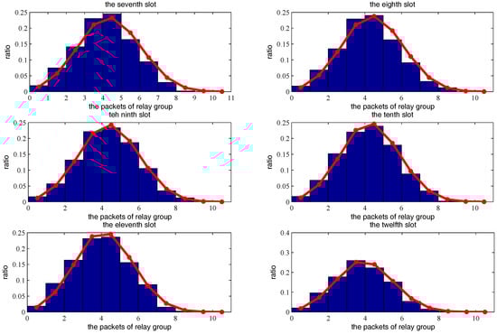 The distribution sequence of the packets left at the relay group, from the seventh slot to the twelfth slot. The red curve is the theoretical result. The blue histogram is the simulated result.