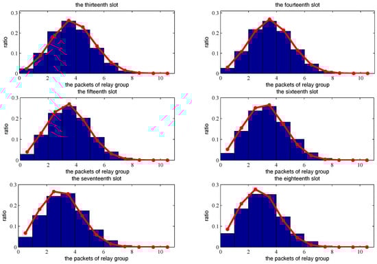 The distribution sequence of the packets left at the relay group, from the thirteenth slot to the eighteenth slot. The red curve is the theoretical result. The blue histogram is the simulated result.