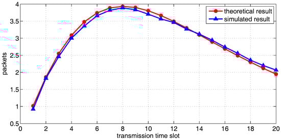 Figure 15, Figure 16 and Figure 17 show the theoretical and simulated distribution sequence of packets left at the relay group, from the first time-slot to the eighteenth time-slot. Figure 18 shows the mathematical expectation of packet numbers in different transmission slots. Good agreement between the analytical model and simulated results also can be observed. The packets of relay group reach the peak in the eighth time slot but begins to decline gradually in the later time slots.