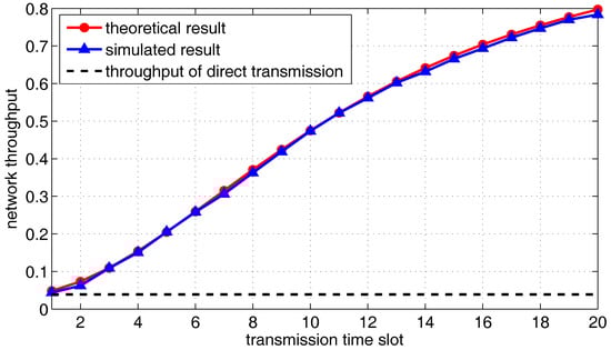 Finally, the overall packet delivery rate is presented in Figure 19, where both theoretical results and simulated results are plotted. The result of direct transmission is also plotted for comparison. As shown in Figure 19, the network throughput increases over time and is much better than the case where only direct transmission is allowed. The gradient of throughput reaches the maximum in the eleventh slot but slowly decreases in the later time slot. Therefore, corresponding to different parameters of UACN model, we can set the optimal transmission delay according to the theoretical derivation, which achieves high network throughput based on appropriate delay.