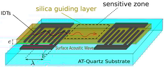 Our SAW sensor is based on a delay line built on an AT-cut quartz substrate (cf. Figure 1). The choice of the AT-cut is based on the fact that it exhibits a low frequency-temperature coefficient (FTC) [21] making it well suited for sensor applications. The interdigitated electrodes (IDTs) consist of 200 nm thick aluminum double-electrodes deposited using a conventional photolithography process. Each finger is 5 μm wide and the space period p is 10 μm yielding to an acoustic wavelength = 40 μm (cf. Figure 1). The “double-electrode” configuration was chosen to get rid of triple transit reflection phenomenon, therefore avoiding the appearance of ripples in the interrogation bandwidth that compromises the phase measurement accuracy [22]. The sensor is based on Love waves (shear mode). The propagation of such a mode requires an additional layer on top of the substrate to guide the wave along the surface. This layer has to present a shear acoustic velocity lower than the substrate’s [23]. We used a silica guiding layer for this purpose ( m/s).