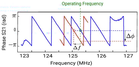 The acoustic shear wave velocity of the substrate being in the vicinity of 5100 m/s, the synchronous frequency of the device is 125 MHz as μm. The wavelength is constant since it depends only on IDT geometry. Consequently, any variation of the wave phase velocity will linearly affect the synchronous frequency. This frequency decrease is measured by monitoring the phase signal with an open loop interrogation using a dedicated electronics [24]. Figure 2 presents the phase measurement principle at constant frequency. The blue curve represents the phase response of the SAW device before interacting with the particles. The red curve corresponds to the phase after the frequency shifts by due to the mass effect. The phase being a linear function to frequency in the vicinity of the operating frequency (in green), the frequency shift can be determined by measuring the corresponding phase shift .