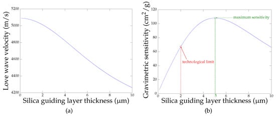 Figure 3a shows the velocity of a Love wave as a function of the thickness of the silica guiding layer e. From this graph, one can calculate the gravimetric sensitivity of the device using the Equation (1) with m/s the shear wave velocity of the substrate and g/cm3 the density of the silica guiding layer.