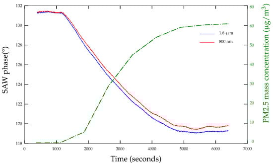 To compare their performances in practice, we exposed them to PM2.5 particles inside a temperature controlled Mikron VCE-1000. The particles are mainly submicron fine particles (PM1) generated from a burning candle. A reference aerosol spectrometer G 11-A (Grimm®, Ainring, Germany) based on light scattering is used to measure particle mass concentration in the room in real time. Figure 5 presents the phase of two Love wave devices exposed to particles inside the room. Both sensors see their phases decrease as the concentration of the particles in the room increases. However, one can observe that the SAW device with a 1.8 μm guiding layer shows neither a significantly greater phase shift, nor higher sensitivity compared to the one with a 800 nm thick guide. For this reason, we have chosen to work with 800 nm guides for our sensors since thickness homogeneity is more reliable for μm.