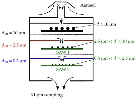 Schematic of a cascade impactor containing SAW sensors positioned as collection plates to measure the particle concentration in real time.