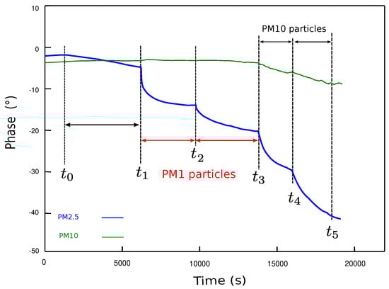 Figure 9 presents the evolution of the SAW sensor’s phase during four successive exposures to particles in indoor conditions. The phase measurement is performed in a differential mode, which means that each sensor contains a couple of identical SAW delay lines: one receives the particles to measure and the other stays free of particles and works as a reference. By subtracting the two phase signals, we get rid of any contribution due to external operating conditions to measure only the gravimetric effect due to particles. During the first phase of the experiment from to , no particles are generated. The blue curve, related to the PM2.5 stage, decreases very slightly indicating the presence of a few particles smaller than 2.5 μm in the room. At , PM1 particles are generated using a burning candle. As a consequence, the phase of the PM2.5 stage decreases but not the PM10. Indeed, there are no particles bigger than 2.5 μm in the fume emanating from a burning candle [32]. The same PM1 particles are generated a second time at and the sensors respond in a similar fashion. At , we expose the device to particles generated using a soldering iron. The emanating aerosol contains this time particles both in the ranges [0, 2.5 μm] and [2.5 μm, 10 μm] [33]. Therefore, both stages show a decreasing phase although the PM10 exhibits a weaker response compared to the PM2.5 indicating that fewer particles are larger than 2.5 μm [33]. At we repeat the same particle generation process with a similar response for both sensors, showing the repeatability of the measurement.