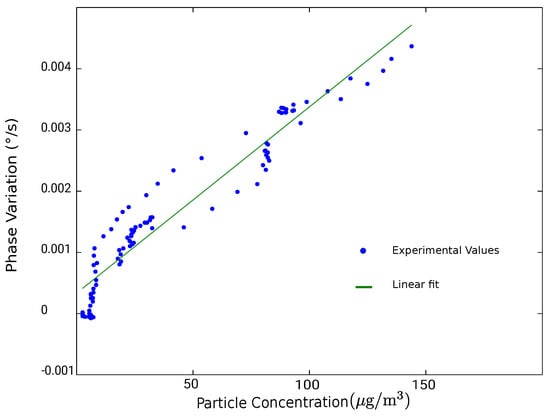 Figure 12 presents a comparison between the phase variation (in green) of the SAW sensor with the concentration of the particles (in blue) measured with an optical counter “ePM” manufactured by Ecologicsense® (Rousset, France). One phase measurement was recorded every second and the plotted data correspond to a sliding average over one hour window. We can observe that both curves follow a similar pattern indicating a correlation between the phase variation of the SAW sensor and the particle concentration. Figure 13 shows a plot of the phase variation as a function of the particle concentration from Figure 12. The system’s sensitivity, which is estimated by applying a linear fit of the plotted data, is 0.03 meaning that with a phase measurement precision of 0.001°, we can detect 1 μg/m3 particle concentration within less than one minute sampling.